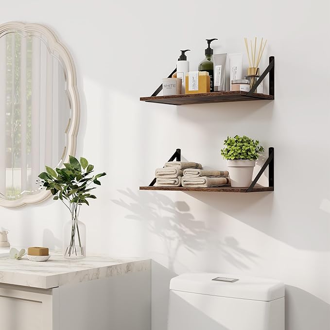 - [Large Capacity Floating Shelves] - Our wall shelves are 16" long x 8" deep, providing ample storage or display space for your kitchen, living room, bedroom, bathroom, laundry room, and more. With such a large space, you can place many items like books, collectibles, plants, crafts, photos, laundry detergent, etc. Our shelf can even be used as a bookshelf or a nightstand. Let our shelves decorate every corner of your home!