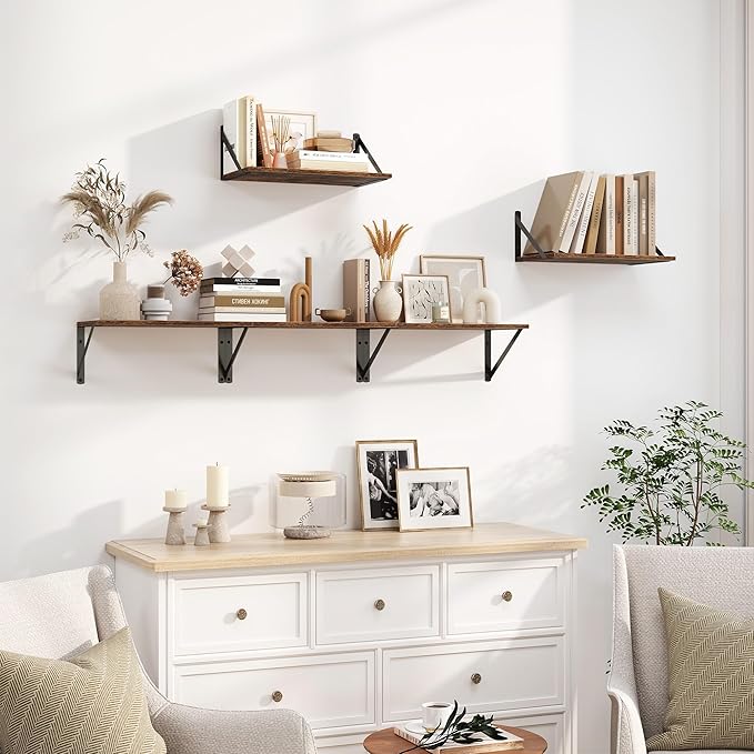 - [Discover More Organization Space] - Don't worry about cluttered desktops and floors! Why not try using the walls? The wonderful combination of smooth-surfaced metal brackets and engineered wood board texture decorates your home with a natural and rustic beauty! Great for organizing books, collectibles, plants, and trophies on the wall without occupying floor space.