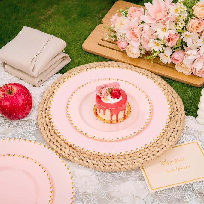 - Elegant Design:Our pink plates disposable heavy duty use a classic round plates,decorated with a gold beads around the edge of the plates.Our pink party supplies can help you better arrange the table and make the food look more delicious