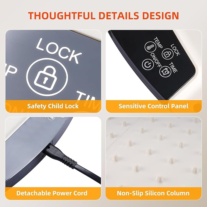- 【Child Lock Design】 To ensure safety, the warming mat features a child lock design to prevent accidental misuse by children and a "lift-up" design on the bottom to allow heat dissipation, making it suitable for tables of different materials and textures. Enjoy peace of mind while keeping your food warm with this food warmer mat.