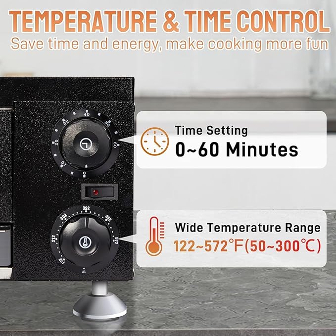 - Precise Cooking: The indoor pizza oven equipped with two precise temperature control systems, which can respectively control the upper and lower temperatures, and one time control system, the scale ranges from 50 to 300℃(122 to 572°F), and 0 to 60 minutes. It can be precisely adjusted according to the requirements of different ingredients. Once the instruction is completed, a prompt "beep-beep" sound will be emitted, eliminating the need for manual supervision. It is both convenient and efficient.