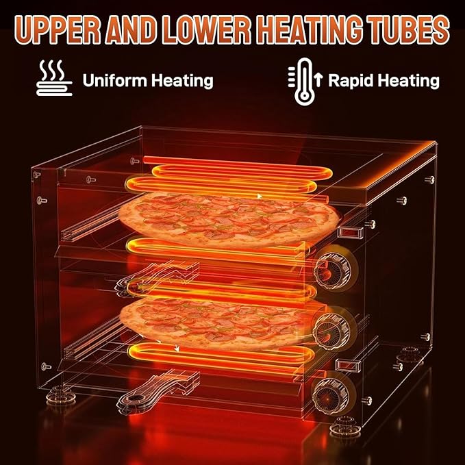 - 【High Efficiency and Even Heating】-Equipped with an innovative upper and lower partitioned heating tube system that allows for rapid and even heating, ensuring your pizza is perfectly cooked with a consistently golden color throughout.