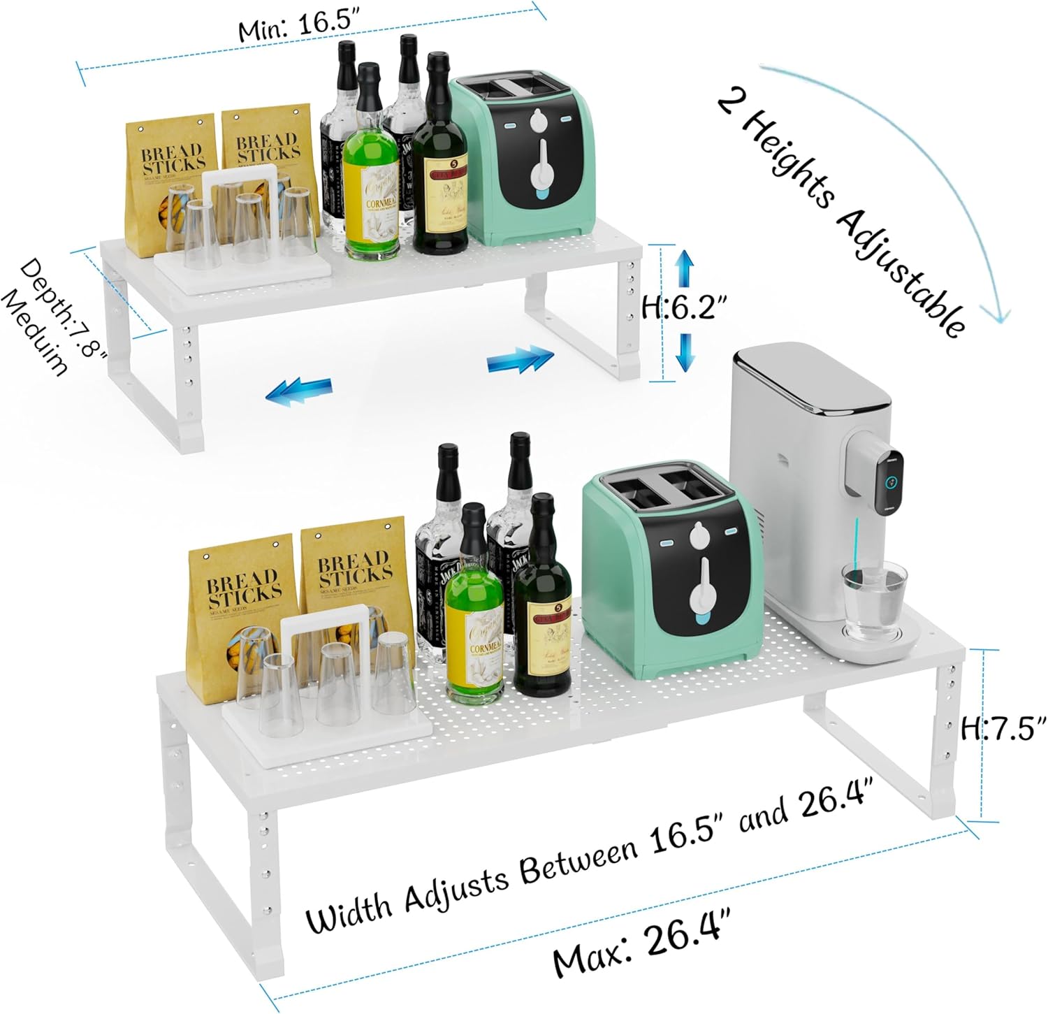 - ✅【Adjustable & Expandable Cabinet Shelf Organizer】 Customize your kitchen storage with our expandable metal shelving unit! Easily adjust the length from 16.5" to 26.4" to fit cabinets, countertops, or pantry spaces (dimensions: 16.5~26.4"W x 7.8"D x 6.2~7.5"H). Stack multiple units vertically to create a tiered storage solution for maximum space efficiency—perfect for plates, bowls, mugs, or canned goods.
