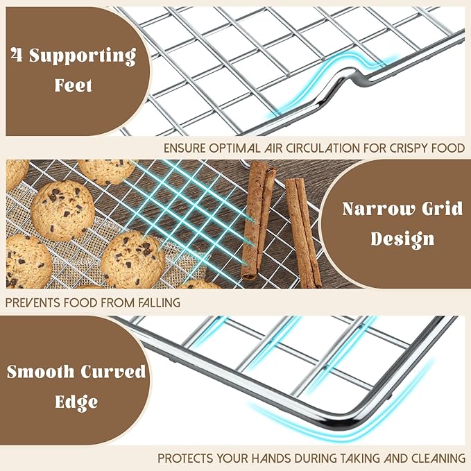 - Reinforced Heavy-Duty Grid Design: Featuring a thickened, reinforced grid pattern, these wire racks for baking offer superior stability and weight-bearing capacity. Perfect for holding hefty baked goods, roasted meats, or multi-layer desserts without sagging or bending – even under heavy loads