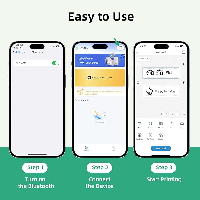 - Multiple Creative Functions: The Snap & Tag app for this Bluetooth label maker provides various features and templates, easily create label stickers with text, QR codes, barcodes, materials, images, time, and borders; Customize label lengths with continuous tape, or use fixed-size labels for batch printing, featuring a built-in cutter for simple label cutting