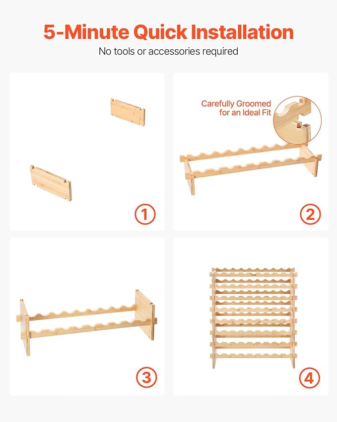 - Effortless Assembly: Set up the wine storage in just 5 minutes—no tools, screws, or nails required. The assembly process is simple, but ensure all parts are correctly aligned before starting. For security, remove all bottles before repositioning the rack.