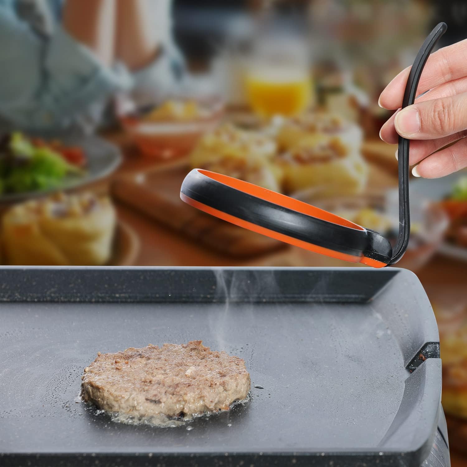 - Silicone Egg Form: Nonstick pancake mold can only be used with a flat pan otherwise the egg liquid will leak sideways, large egg mold for cooking is quick and easy for cooking, egg sandwich maker not only make the egg less leaky, but also keep the egg round. just lift up the small handle, place on your griddle or frying pan to cooking! Cook it in a pancake ring and enjoy a delicious omelette in a few moments, saving time and making a healthy and perfect.