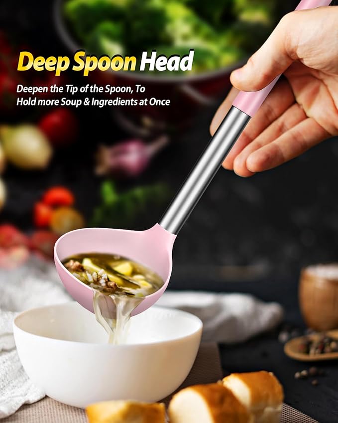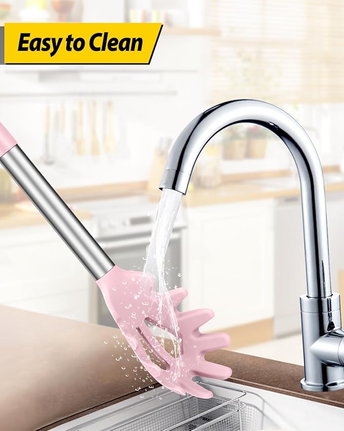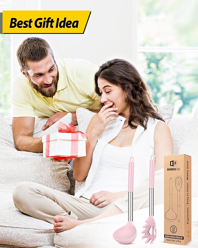 Silicone Pasta Fork and Ladle Spoon Set, Large Non Stick Kitchen Utensils for Cooking,Stirring,Serving Spaghetti, Soup, Sauce (PINK)