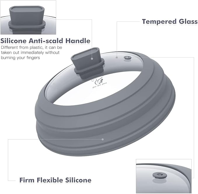 Microwave Splatter Cover Glass Cover Guard Lid with Collapsible Silicone for Food Pot Plate Cover 9.8 inch Light Grey