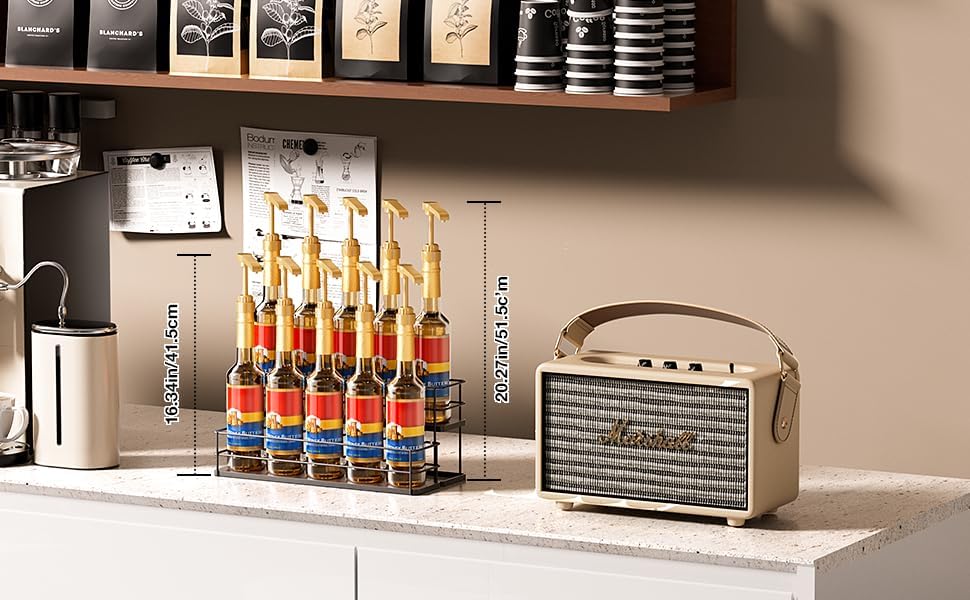- ·【Versatile and Easy to Maintain】🏠- Beyond coffee syrups, use this rack to neatly store cooking spices, condiments, mugs, or decorative items. The smooth metal finish makes cleaning a breeze with just a damp cloth.