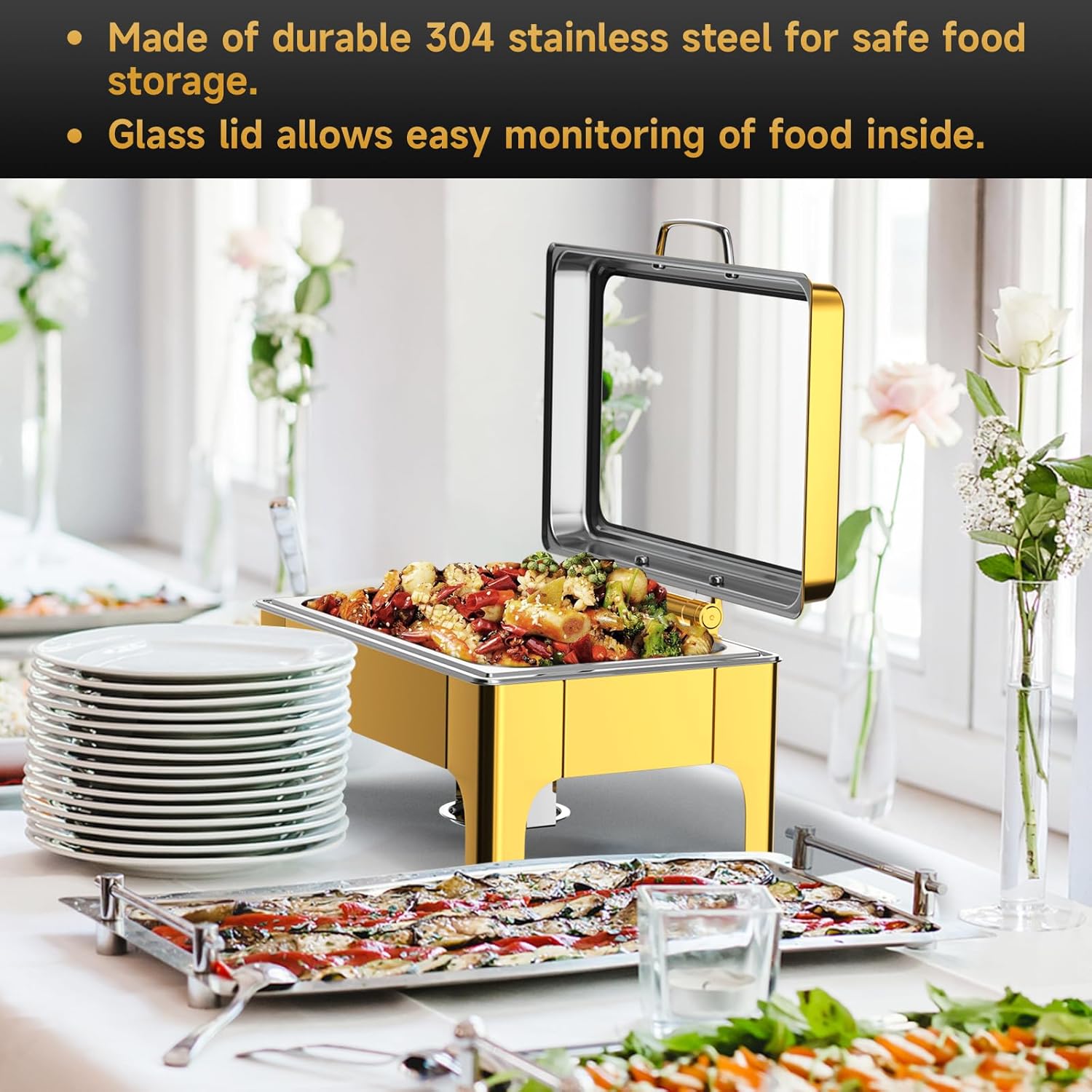 - Food-Grade 304 Stainless Steel + Water Level Indicator Durable and rust-resistant, this food warmer for parties buffet setup features a clearly marked water guide for safe heating and long-lasting use.