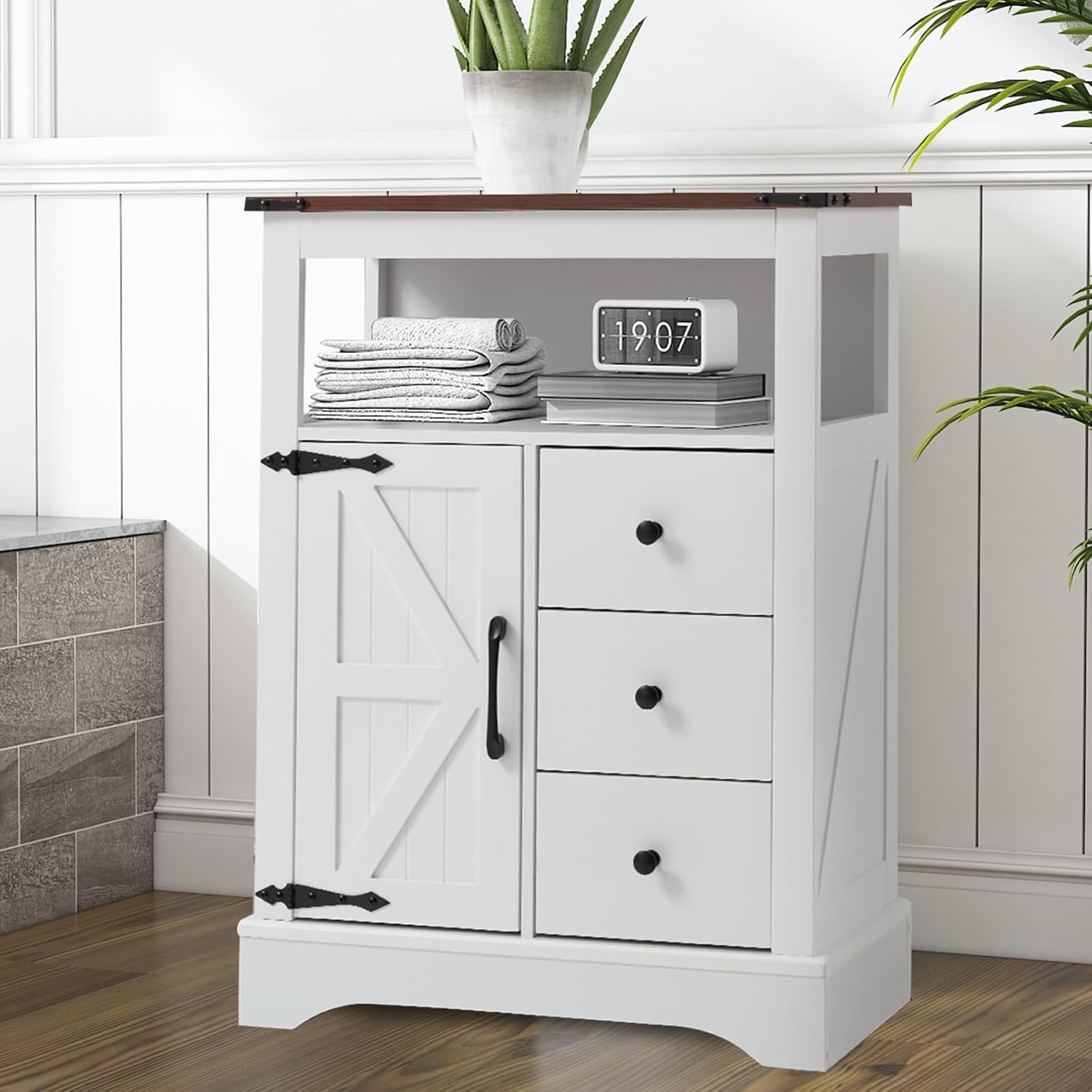 - 【FARMHOUSE RUSTIC STYLE】Crafted from sturdy engineered wood with a distressed natural wood grain top, this cabinet enhances your home with a charming farmhouse aesthetic. The magnetic doors with metal handles ensure smooth and effortless opening.