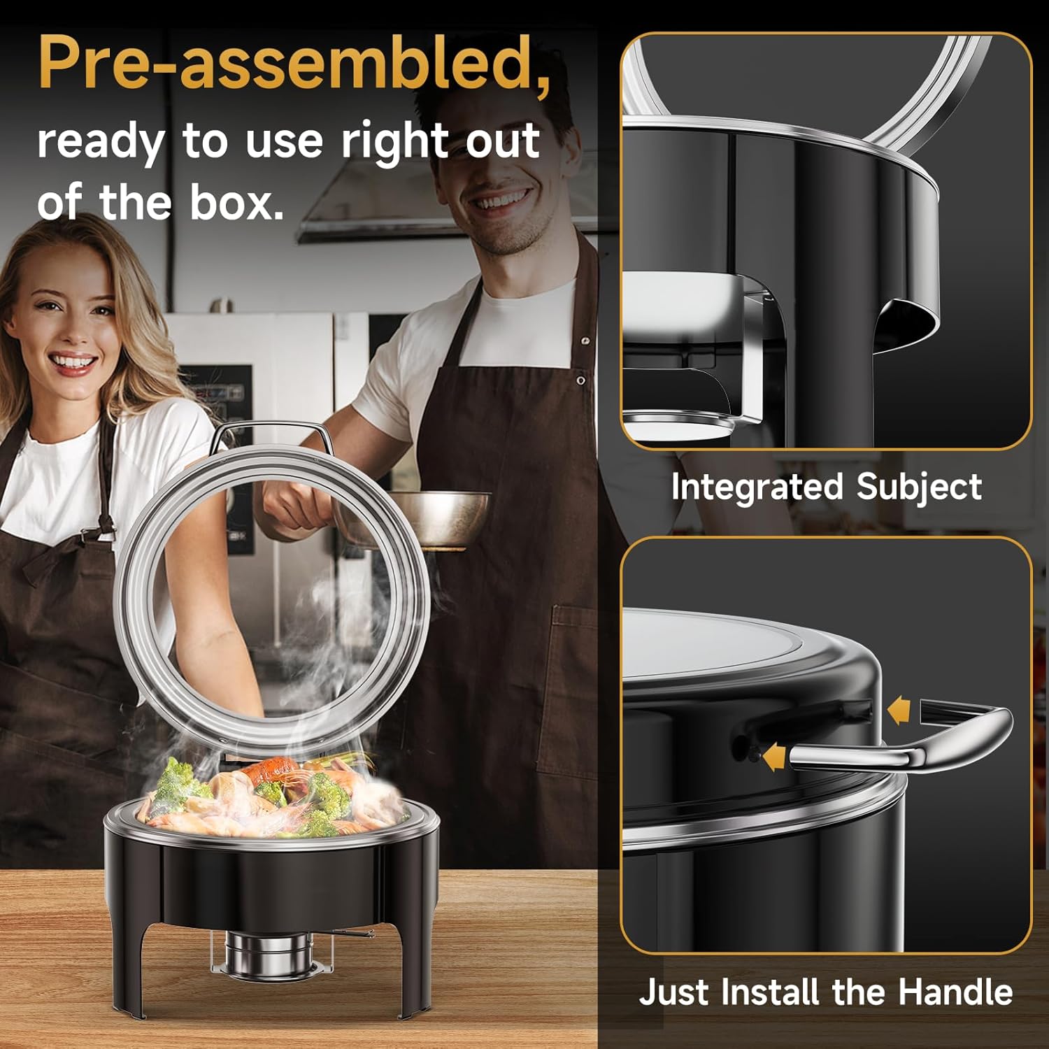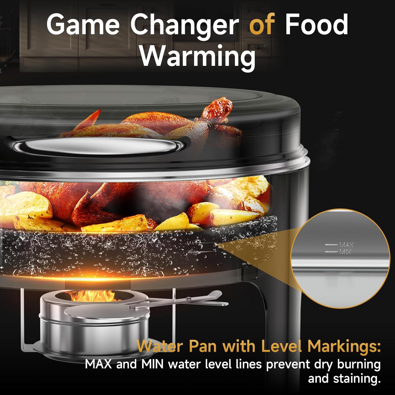Chafing Dishes for Buffet, 6QT Round Stainless Steel Chafing Dish with Transparent Hydraulic Lid, 304 Food Pan, Buffet Warmer for Parties and Events (Black)