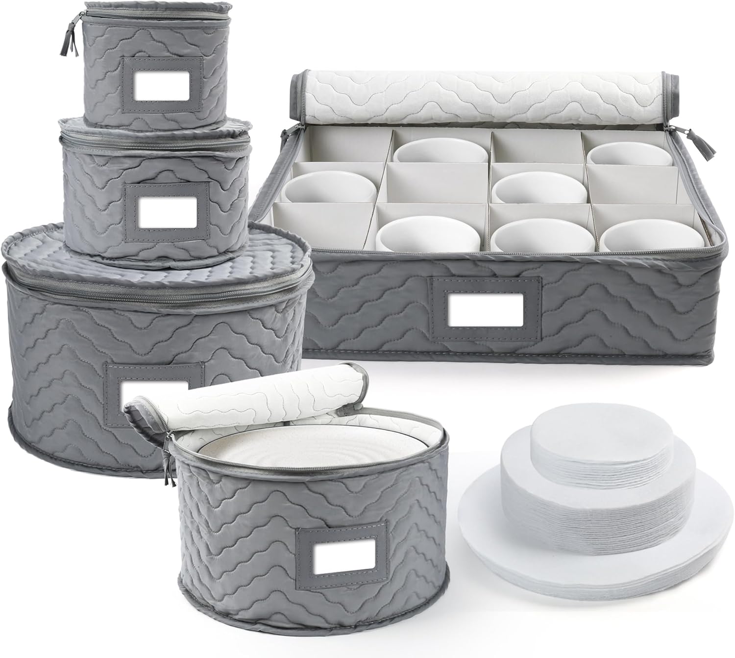 LotFancy China Storage Containers, Quilted 5-Piece Set Storage Box, Chinaware Dinnerware Dish Plate Mug Cup Storage Case, 48 Felt Protectors, Cardboard Dividers Included