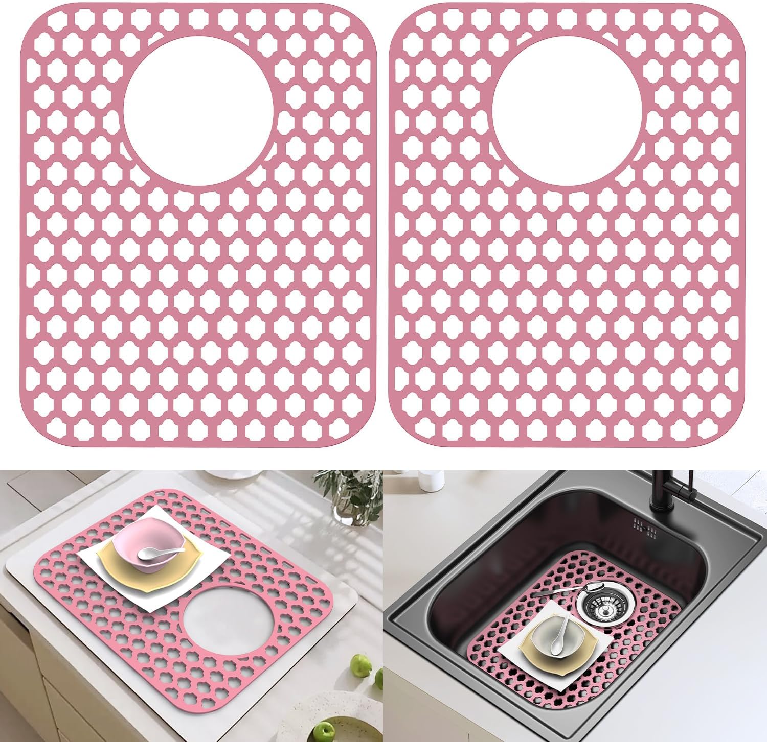 2 Pack Silicone Sink Protector for Kitchen Sink Bathroom, 13.58"x 11.6" Sink Mat Non-Slip and Durable Silicone Protectors, Rear Drain, Pink