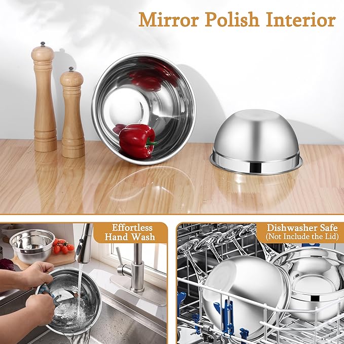- Dishwasher Safe for Easy Cleaning: with its mirrored polished interior, these stainless steel mixing bowls can be easily cleaned by hand, and are also safe for dishwasher-safe, but it is better to hand wash the lids to prevent deformation caused by high temperature