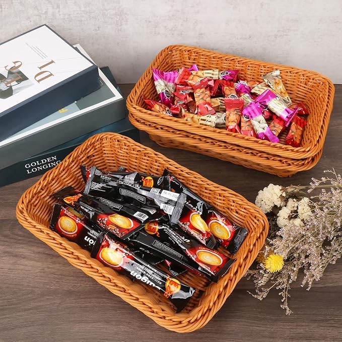 - 【Bulk Pack of 6】 Comes in a Imitation Rattan Rectangular Poly Wicker Baskets pack of 6, providing great value for your money. The pack makes them perfect for businesses such as restaurants, bakeries, dessert shops, and supermarkets. They can be used for displaying bread, pastries, fruits, or snacks, adding a touch of rustic elegance to any retail setting.