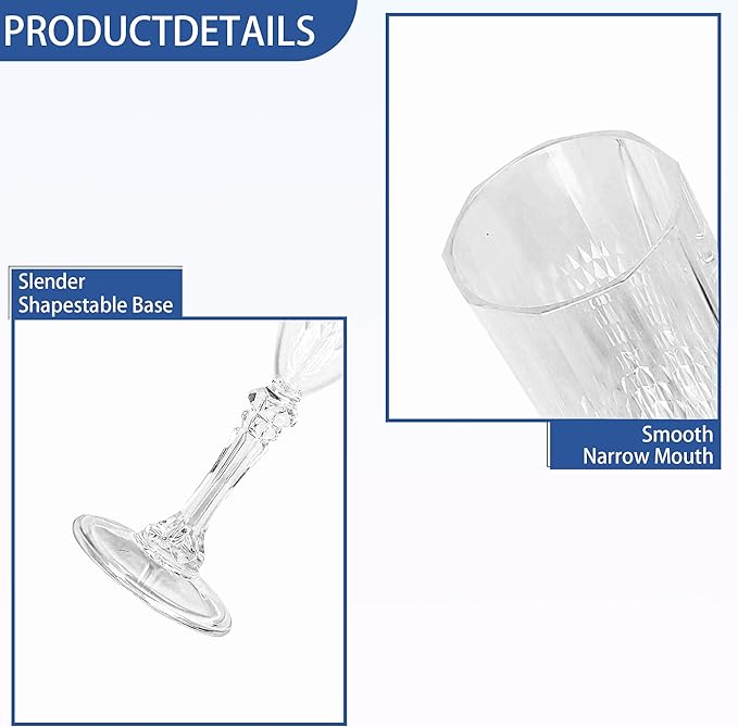- Charming Set: Champagne flutes set include 24 retro-style transparent champagne plastic wine glasses, providing ample quantity to meet your daily use and replacement needs. A suitable champagne cup is the icing on the cake. Plastic wine glasses not only carry the wine, but also carries the laughter and blessings