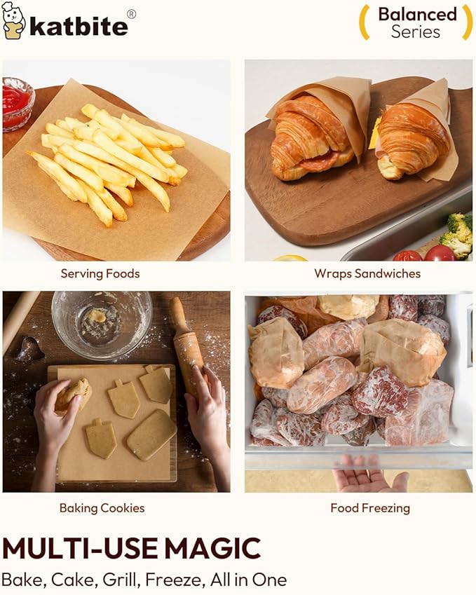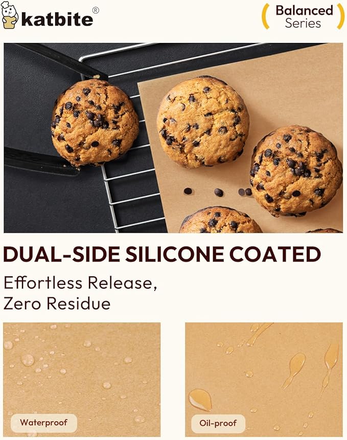 - Non-stick on both sides for easy release: Each baking paper is specially treated on both sides with high-density food-grade silicone coating to create barrier. Perfect for crispy butter cookies, soft chiffon cakes, high-sugar crème brûlée, or even greasy garlic potato wedges - everything releases effortlessly. Solves the common problem of food sticking to baking trays. Just wipe clean after use - no scrubbing needed. Makes baking clean and hassle-free. Katbite, the most trusted baking helper for professionals and home bakers alike.