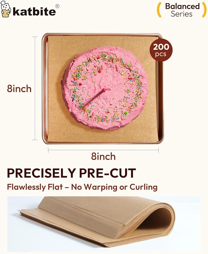 Katbite 200 Pcs Parchment Paper, 8 x 8 Inch Unbleached Baking Paper, Oil Resistant & Easy Clean, Non-Stick Precut Parchment Paper Sheets for Baking Square, Cooking, Air Fryer [Balance Series]