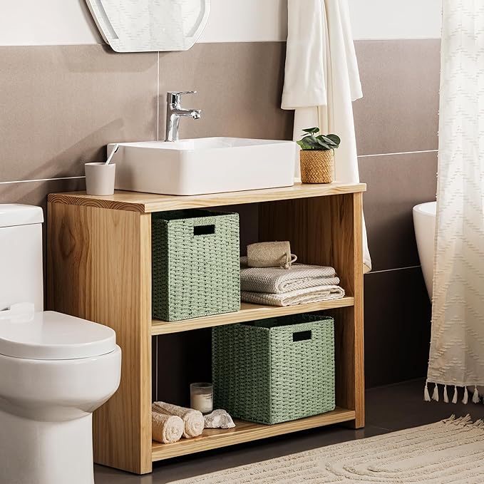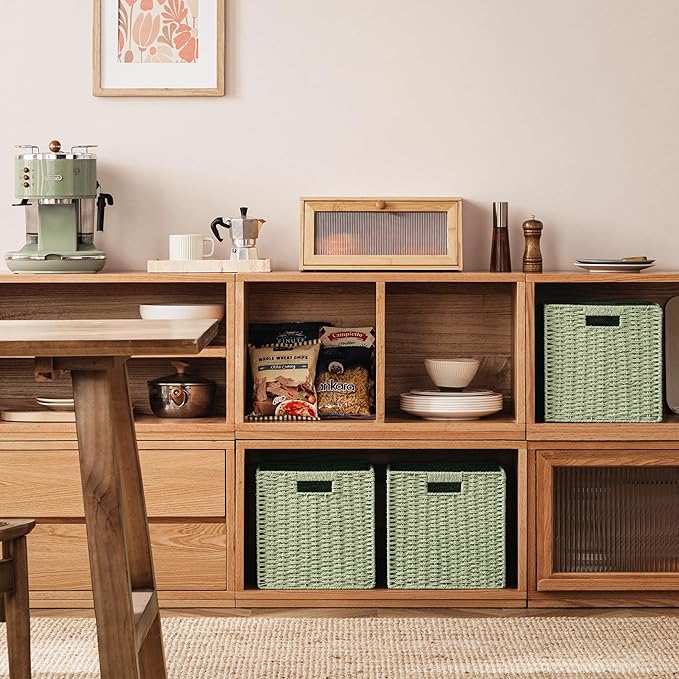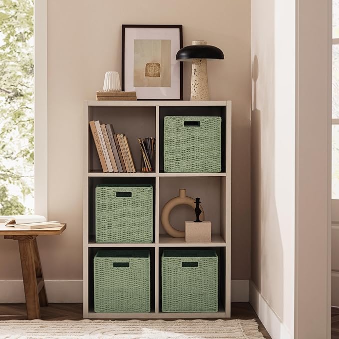 UBBCARE 3 Pack Wicker Basket, 11L×11H×10.5W inch Woven Paper Rope Storage Baskets for shelves, Foldable Cube Storage bin with Handle, Storage Basket for Organizing & Decor, Green