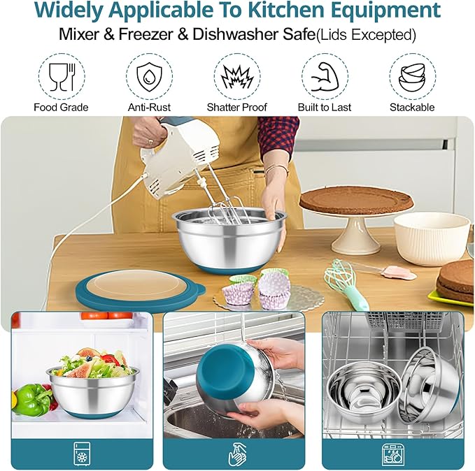 - FOOD-SAFE & LONGEVITY: Our mixing bowls with lids set is made of food grade stainless steel and non-toxic plastic lids, No harmful chemicals to ensure users’ health and safety, Rust and chip resistant, Heavy duty construction make them not easy to break and deform, Stand the test of time and great for long-term use, A huge plus – the bowls are oven safe except for the lids