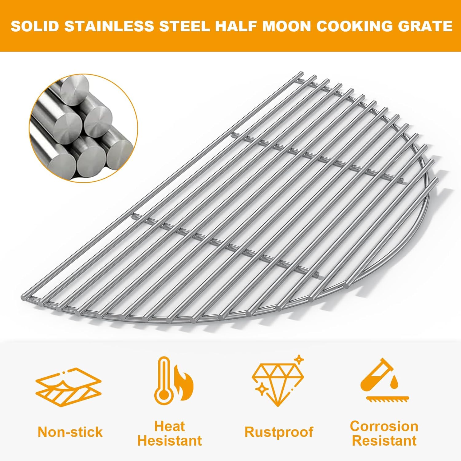 18 inch Stainless Steel Half-Moon Cooking Grate for Kamado Joe Classic Joe Series, Large Big Green Egg, and Other Round 18-inch Charcoal Grills