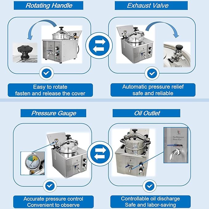 - Excellent Performance: This high-pressure fried chicken stove is made of premium stainless steel and comes with a fitted timer, a variable thermostat, a drain tap, a fryer basket, a pressure valve, a pressure gauge and rubber feet for stability. The body is made of food grade stainless steel material, which is sturdy, durable, corrosion-resistant, easy to clean, and effectively guarantees health and safety