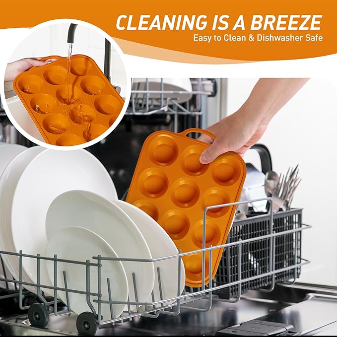 - 【Effortless Release Every Time】Experience 1-second demolding! Simply press the flexible food-grade silicone base to pop out cupcakes intact - no scraping or greasing required. Ideal for sticky recipes like caramel pecan muffins or gooey chocolate lava cakes. Our baking cupcake muffin pan can be safely placed in the dishwasher, and the silicone baking cupcake muffin pan material reduces oil residue by 85% compared to metal baking pans, making it easy to rinse even with simple running water.