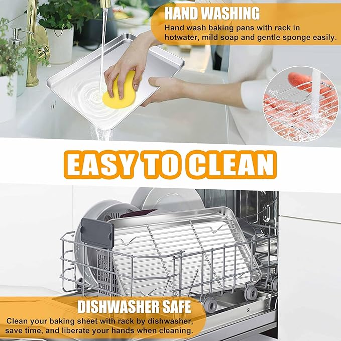 - Sturdy, 12.4*9.6 inch baking tray with rack is deforming resistant, no warping or bending to serve for years, meet your roasting needs and provide a good baking experience, mirror polish keep shiny for easy maintaining, seamless design with round corner make cleaning easily and dishwasher safe
