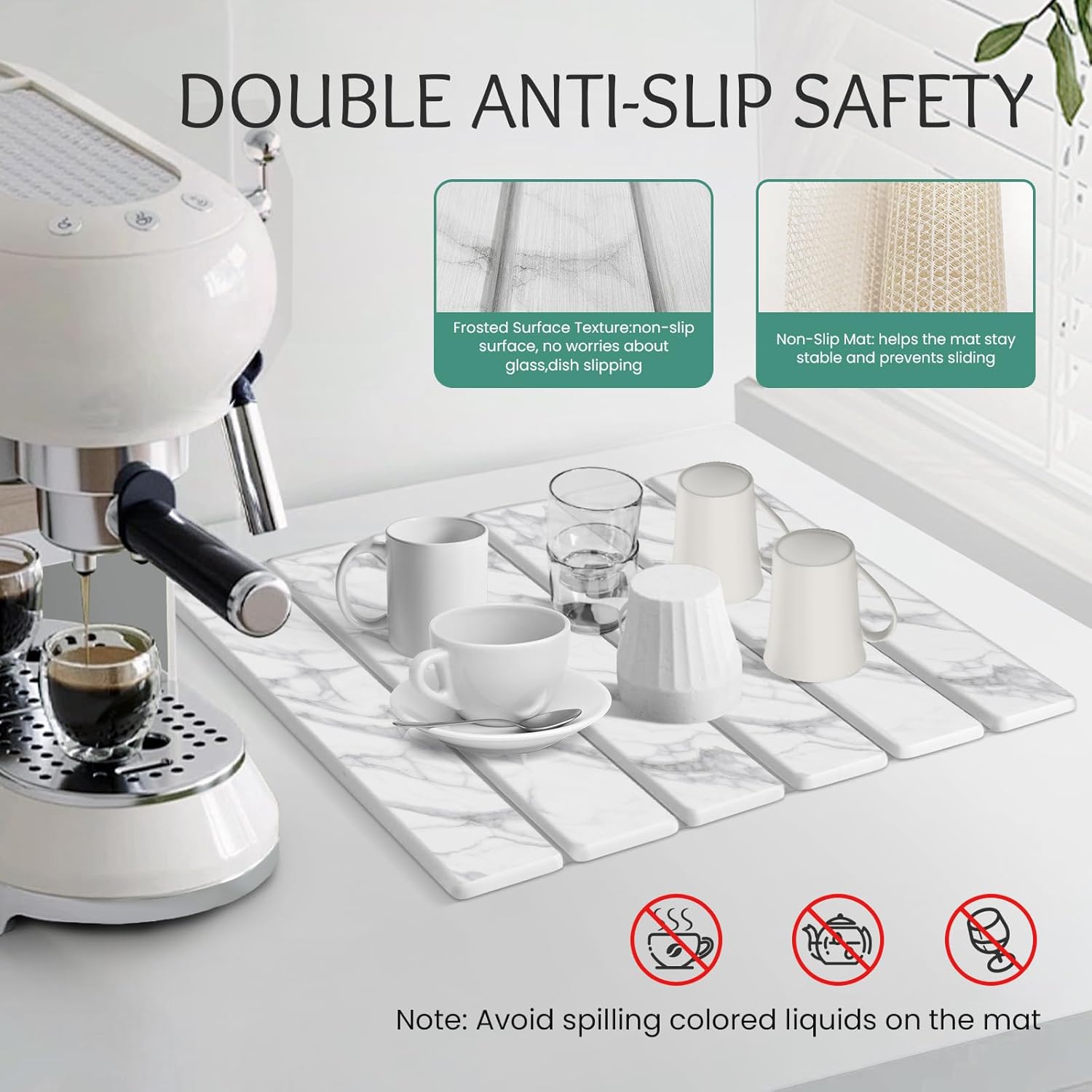 - 【Attention】:Avoid spilling dark liquids on the absorbent mat such as chili oil,soy sauce,red wine,etc.Due to stone drying mat its foldable design,there is a small spine between each panel,if the dishes or items carry a lot of water,which a lot of water will accumulate between the small spine,which is a normal phenomenon;our suggestion for this is to gently shake off the water from the washed utensils or items before placing them on the mat, or to gently wipe the accumulated water on the spine with a dry towel.