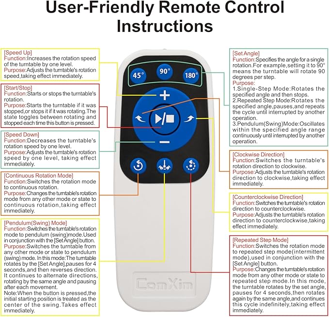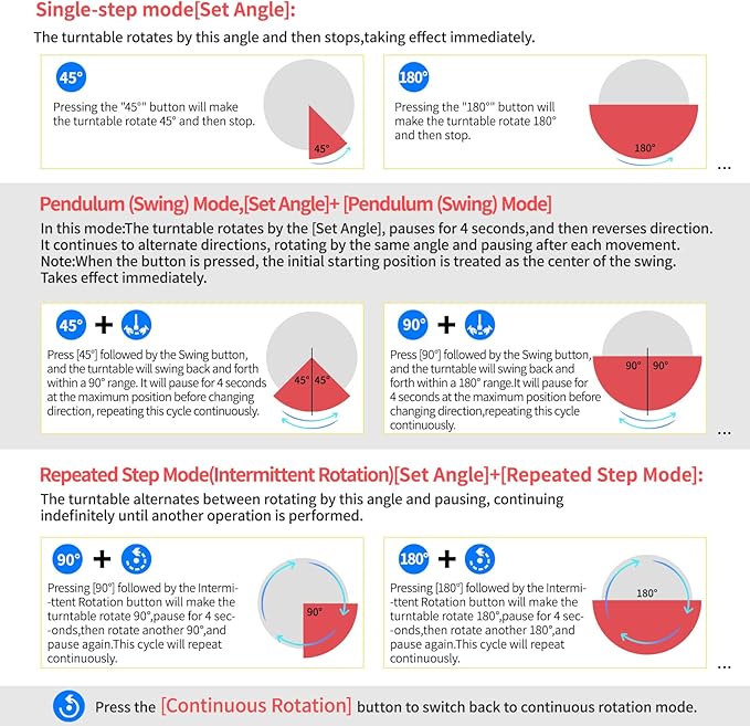 - 【Supports remote control of four rotation modes】: Continuous rotation. Single-step rotation at 45°, 90°, and 180°. Repeated step rotation at 45°, 90°, and 180°. Pendulum (swing) rotation at 45°, 90°, and 180°. Allows remote control for both clockwise and counterclockwise rotation.The display turntable supports remote control for start/pause and speed adjustment (increase/decrease).