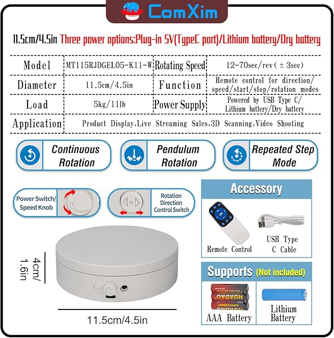 - 【Three Power Supply Options】: This 360 rotating display stand offers three power supply options: Type-C connection, 3 AAA batteries, or a pointed-head 18650 rechargeable battery, providing flexible power choices. Type-C power is ideal for indoor use, while batteries are suitable for outdoor or power-limited environments. <b>Note:</b> The display turntable package does not include the required AAA batteries or 18650 lithium batteries. Both AAA batteries and 18650 lithium batteries are sold separately.