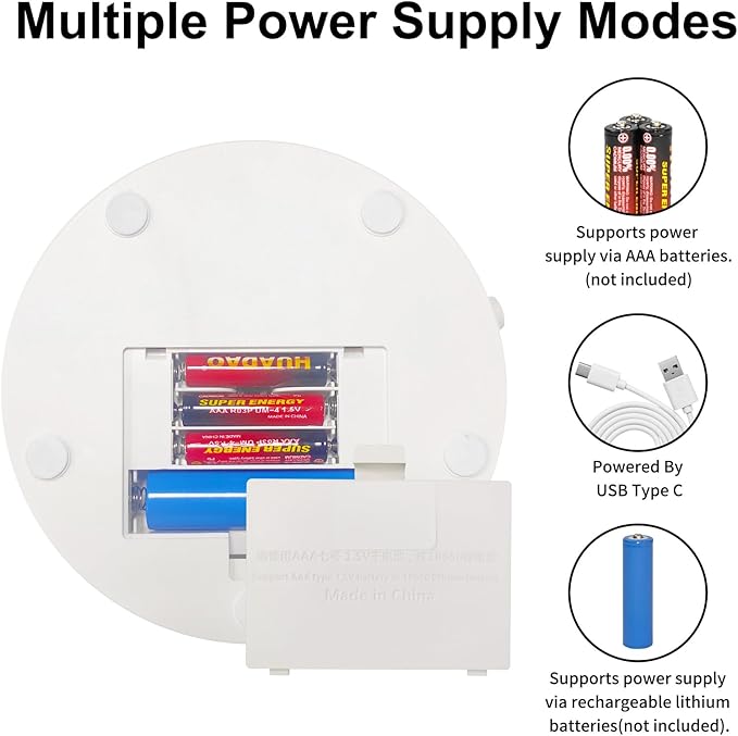 - 【Three Power Supply Options】: This motorized lazy susan offers three power supply options: Type-C connection, 3 AAA batteries, or a pointed-head 18650 rechargeable battery, providing flexible power choices. Type-C power is ideal for indoor use, while batteries are suitable for outdoor or power-limited environments. <b>Note:</b> The product package does not include the required AAA batteries or 18650 lithium batteries. Both AAA batteries and 18650 lithium batteries are sold separately.