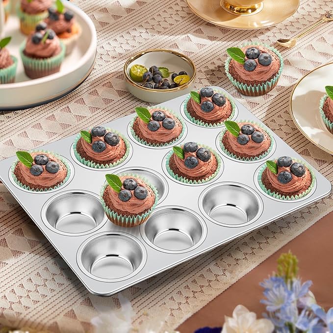 - Easy to clean, thick muffin pan for baking with smooth edges for comfortable to grab from the oven, premium stainless steel cupcake tins offer superior heat conductivity for evenly baking and uniform browning, nonstick brushed surface for easy food release and effortless cleanup, dishwasher safe