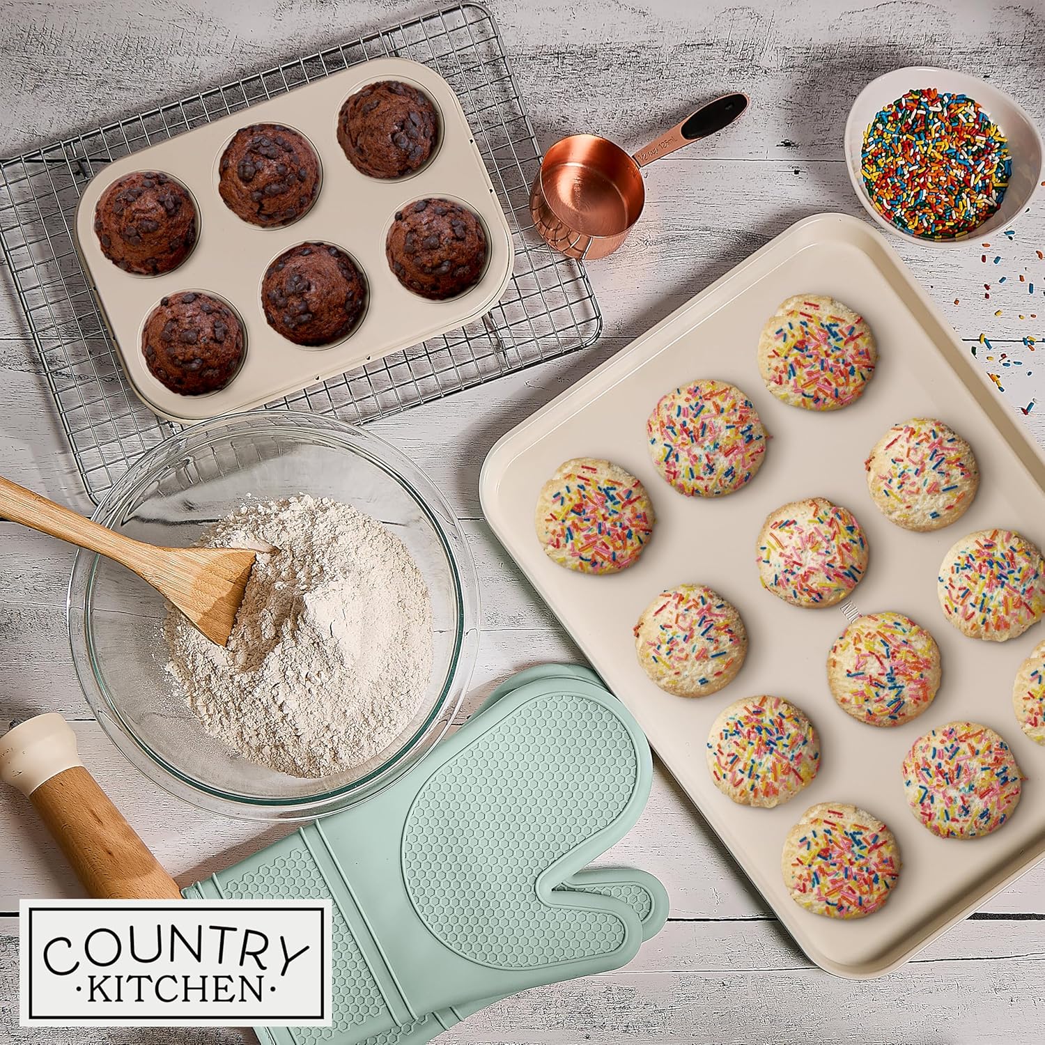 Country Kitchen Nonstick Stackable Bakeware Set - Deluxe Heavy Duty, Durable, Easy Release Baking Set, Sage, 13 Pcs with Handles