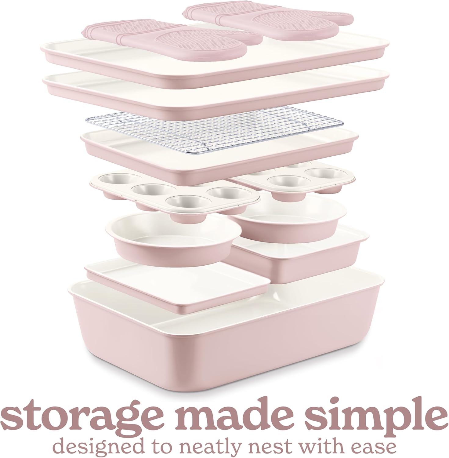Country Kitchen Nonstick Stackable Bakeware Set - Deluxe Heavy Duty, Durable, Easy Release Baking Set, Pink, 13 Pcs with Handles
