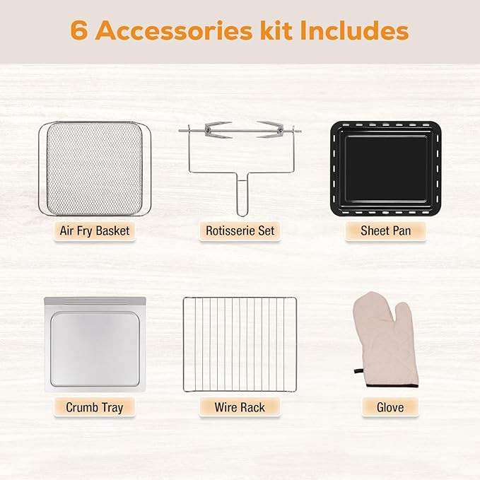 - π¦ 6 Accessories for Everything: Air fry basket, wire rack, crumb tray, rotisserie kit, roast basket and glove.