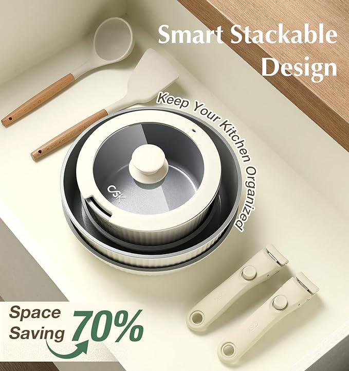 KOCH SYSTEME CS 17pcs Pots and Pans Set Non Stick, Nonstick Ceramic Cookware Set Detachable Handle, Induction Kitchen Pot and Pan Set, Non Stick with Removable Handle, RV Cookware Set, Cream White