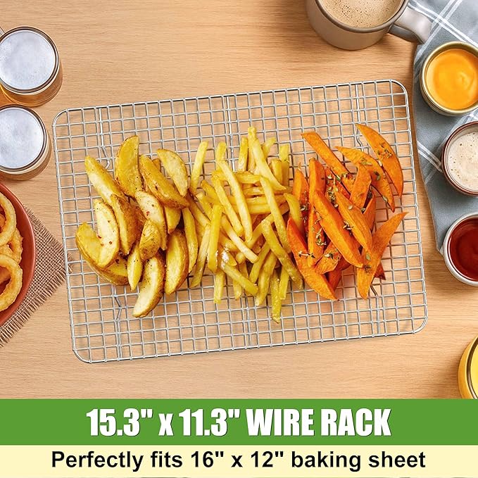 - Perfect size, 15.3" x 11.3" x 0.75" cooling racks fit perfectly inside 16" x 12" jelly roll baking pans and they can also be used separately, the cooking racks are oven safe up to 450 °F so you can bake and cool the baked foods in one rack, mirror finish for effortless food release