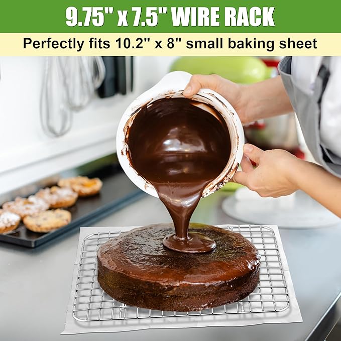 - Perfect size, 9.75" x 7.5" x 0.75" cooling racks fit perfectly inside 10" x 8" small sheet pans and they can also be used separately, the cooking racks are oven safe up to 450 °F so you can bake and cool the baked foods in one rack, mirror finish for effortless food release