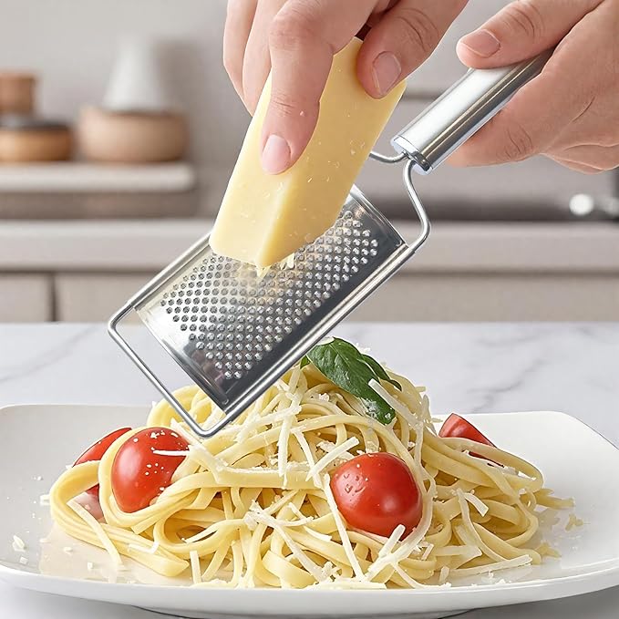 - Space saving: The flat design of the stainless-steel grater makes it easy to store it in any kitchen drawer or cabinet, The handle has holes that are easy to hang,maximizing space and keeping the kitchen organized.