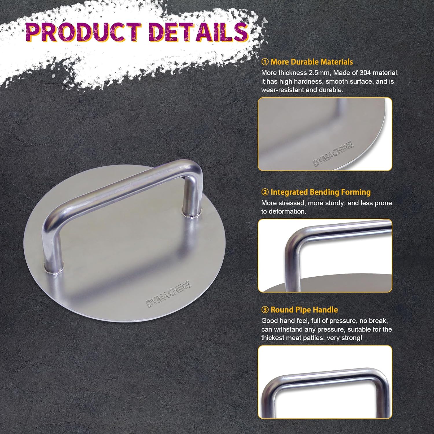 - Specially Designed For Large Meat Patties - DYMACHINE smash burger press made of brushed stainless steel 304 material, integrated bend tube forming, laser welded to the pressure plate in bottom, perfectly combined, extremely sturdy, ensuring worry free cooking time. The diameter of the bent pipe is 20mm, the wall thickness is 1mm, and the thickness of the pressure plate is 2.5mm. The higher thickness makes it easier to shape your meat patty, very practical!