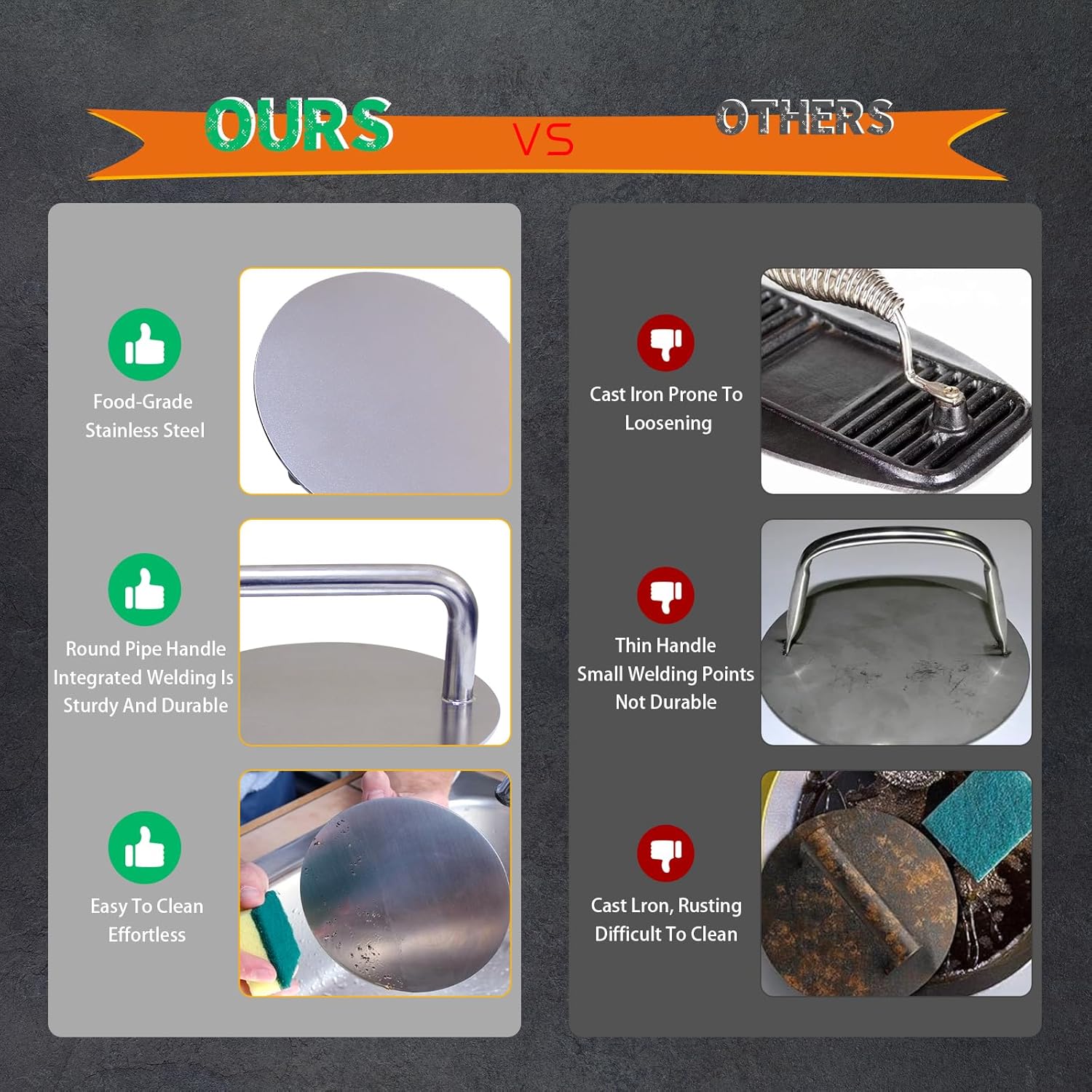 - No Stick/Rust & Easy to Clean - The smooth and flat bottom of the hamburger press makes a uniform thickness burger you want. Smooth, brushed stainless steel reduces sticking to the minimum when pushed down on, no rust. Easy to clean with the flat surface, very friendly to your hands and dishwasher safer.