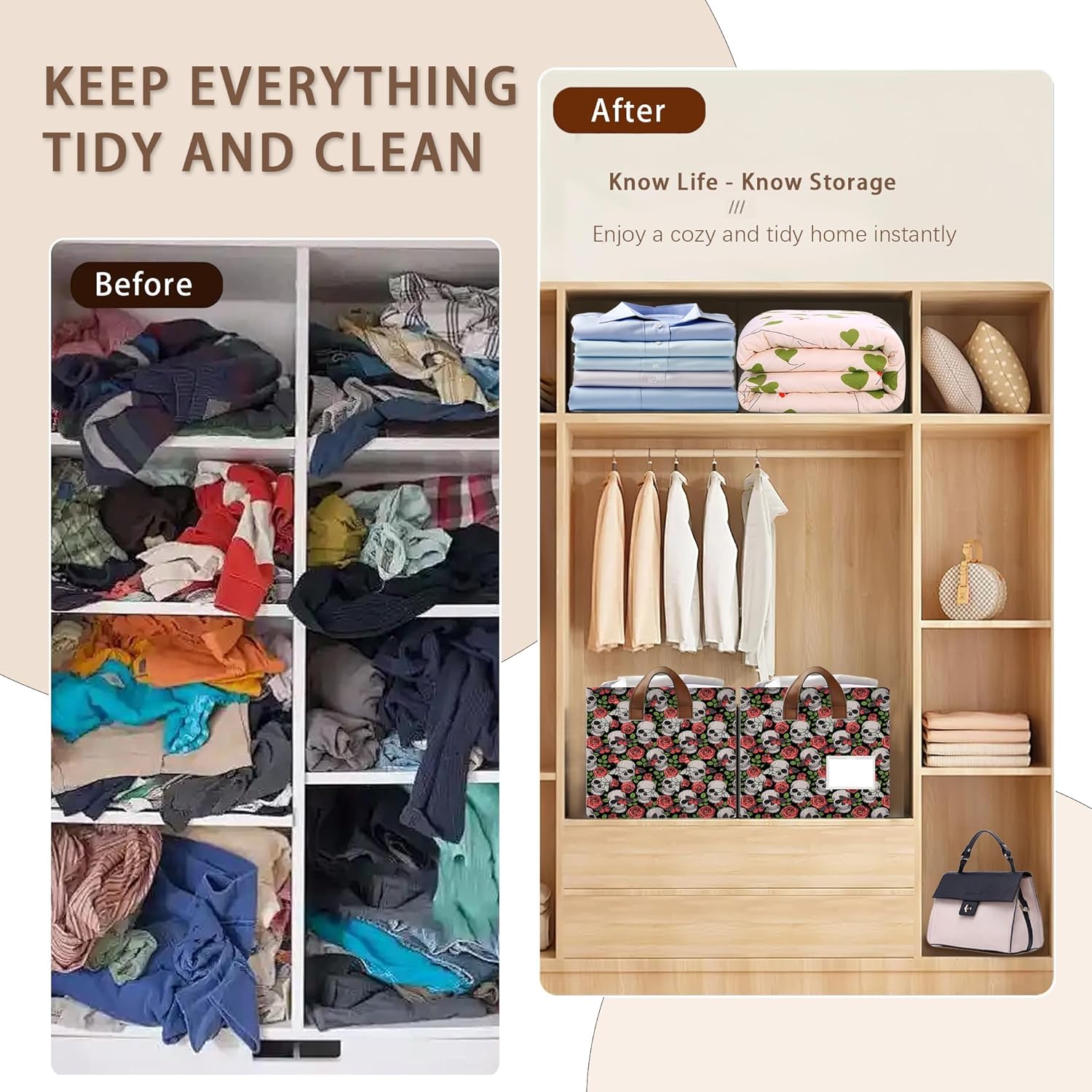 Skull Flower Pattern Collapsible Storage Bin-17x11.5x10.5 Inch Foldable Organizer for Halloween Decor, Gothic Room, Under Bed Storage-Single Pack