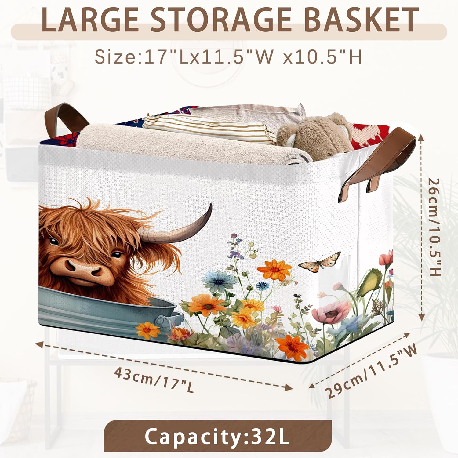 - Conveniently Within Reach: Mogifedc Cute Highland Cow Animal Basket Comes With Leather Handles For Easy Transport. Each Handle Is Reinforced And Secured To The Basket With Extra-Strong Stitching,So The Basket Can Withstand Heavy Loads. Each Of These Soft Handles Ensures a Comfortable Grip,Making Housework a Breeze.