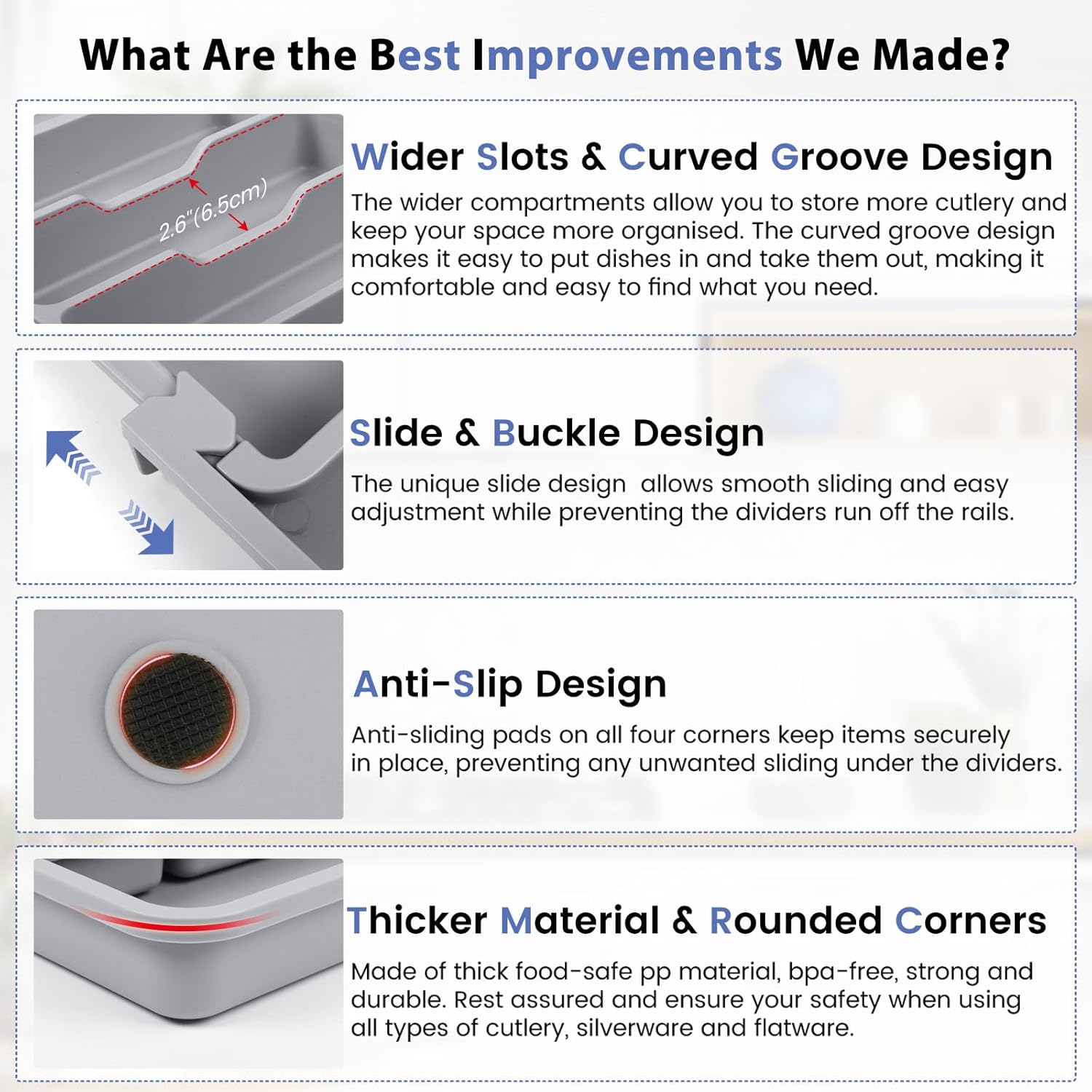 - Non-skid Silicone Feet: 8 strategically placed non-slip feets (not just four corners!) create superior grip on drawer surfaces. No more worrying about the flatware tray moving or tilting when you pull out the drawer.