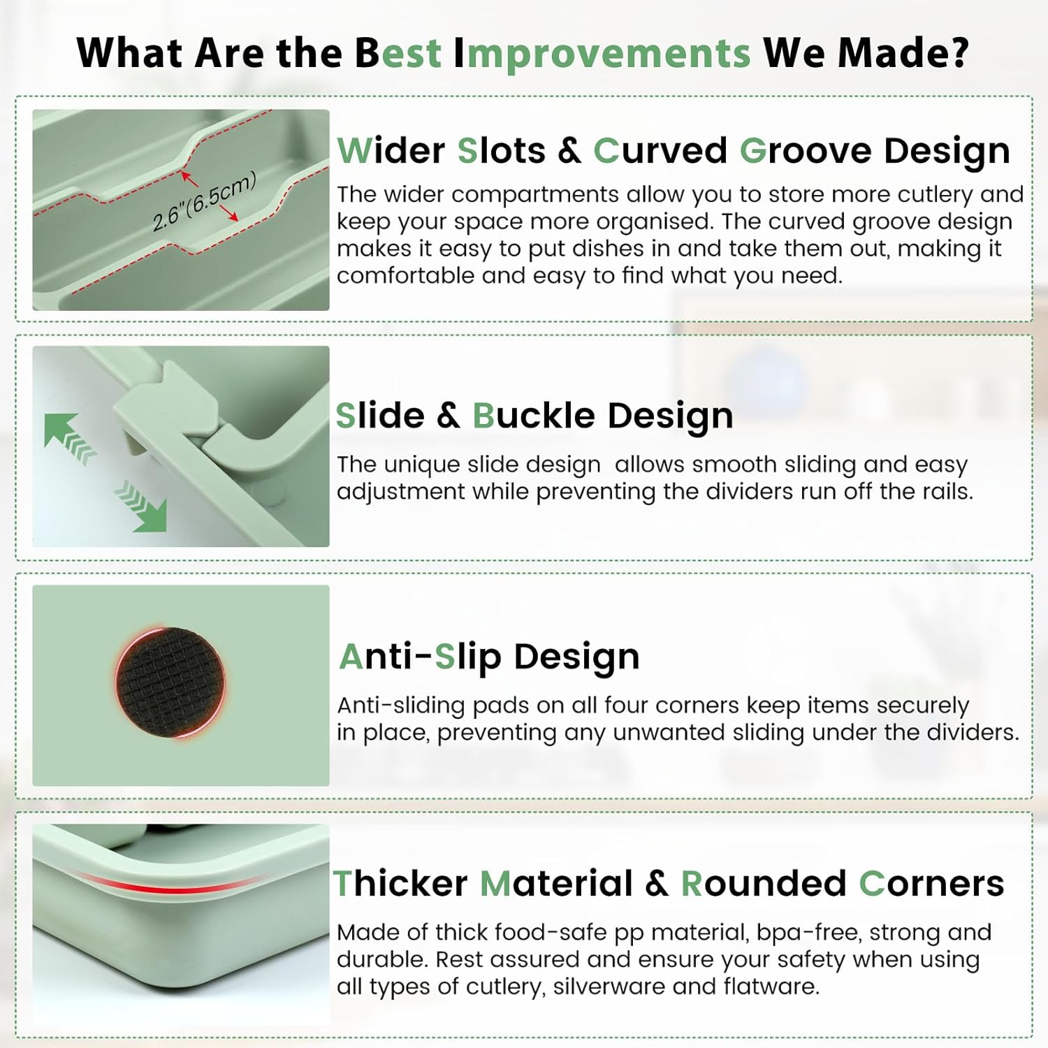 - Non-skid Silicone Feet: 8 strategically placed non-slip feets (not just four corners!) create superior grip on drawer surfaces. No more worrying about the flatware tray moving or tilting when you pull out the drawer.