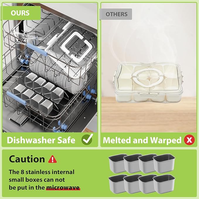 - 【8-Compartment Stainless Steel Snackle Box】Keep sweet, savory, and crunchy snacks separate in this stainless steel snackle box. With 8 compartments, it’s the ideal snack tray with lid to organize fruit, nuts, cheese, and more—no mixing flavors. A perfect snacklebox container for anyone who loves tidy, convenient snacking