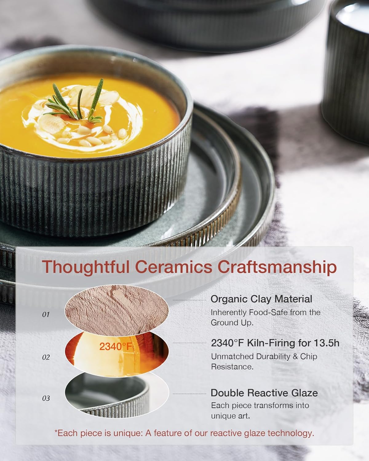 - [Premium Ceramic Durability]: Fired at 2340°F for 13.5 hours, our dishes boast impressive weight and thickness. They can resist chipping, scratching and daily wear, ensuring reliable kitchen use. Enjoy confident daily use, even with silverware